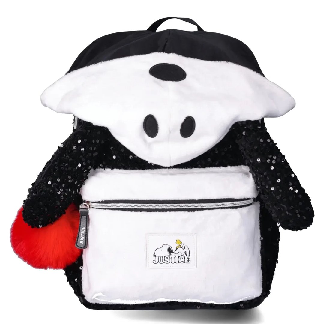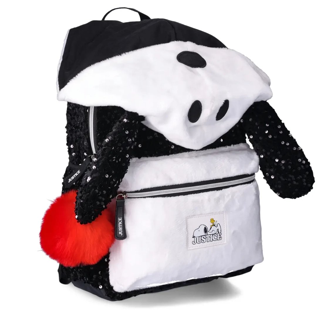 - La moda y los perros siempre están de moda con las mochilas con capucha Justice y Snoopy. Snoopy, la mascota más icónica de Charlie Brown, es leal, divertida, tiene una gran imaginación, es bondadosa y genuinamente un perro feliz.