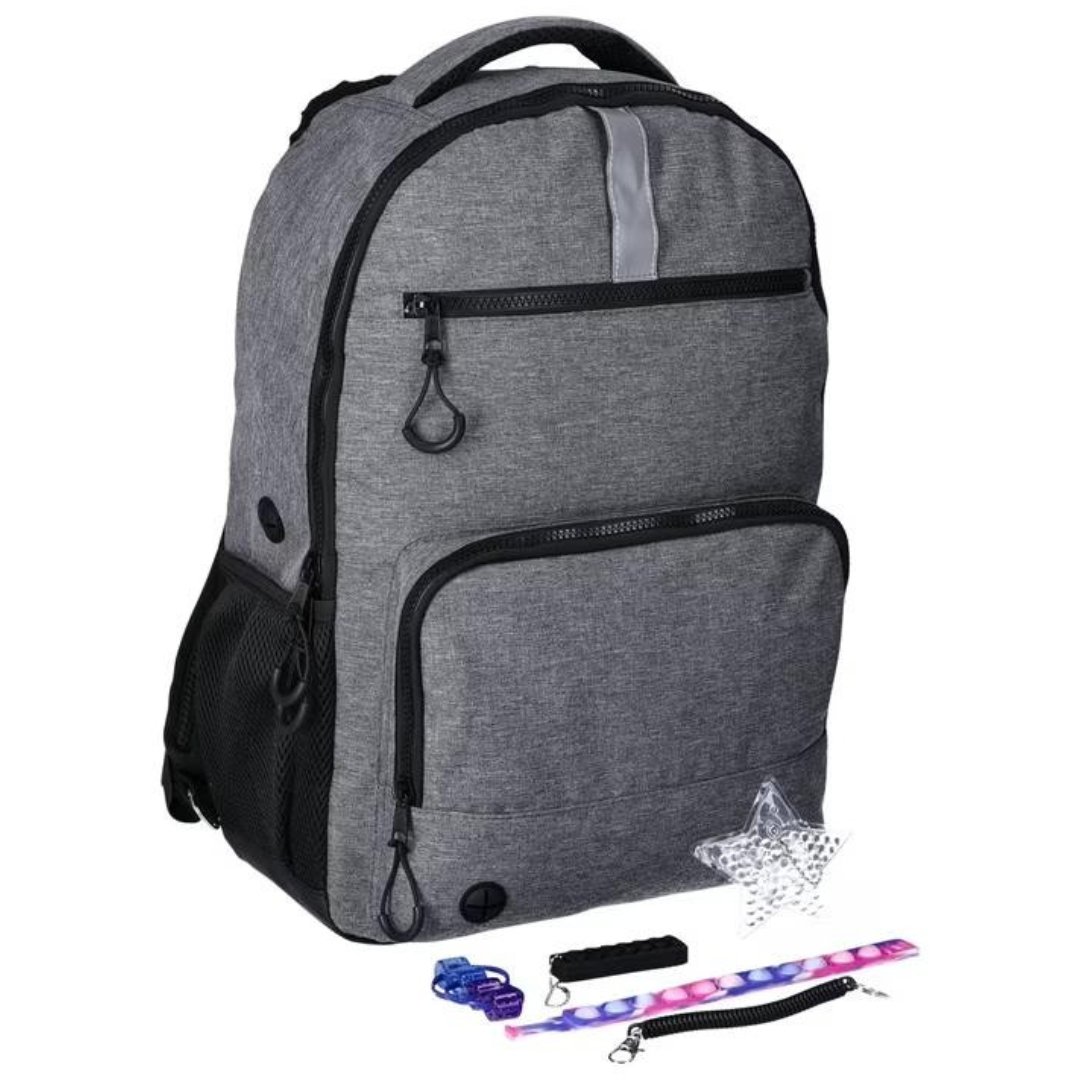 - La mochila cuenta con cinturón de compresión ajustable, pulsera pop-it y fidget spinner.