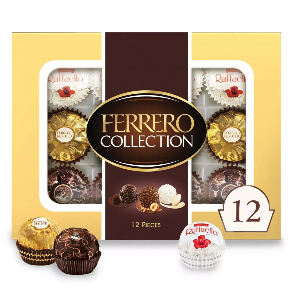 - 12 chocolates envueltos individualmente, una colección de tres de los mejores dulces en capas de Ferrero: Rondnoir, Rocher y Raffaello, presentados en una caja de regalo transparente.