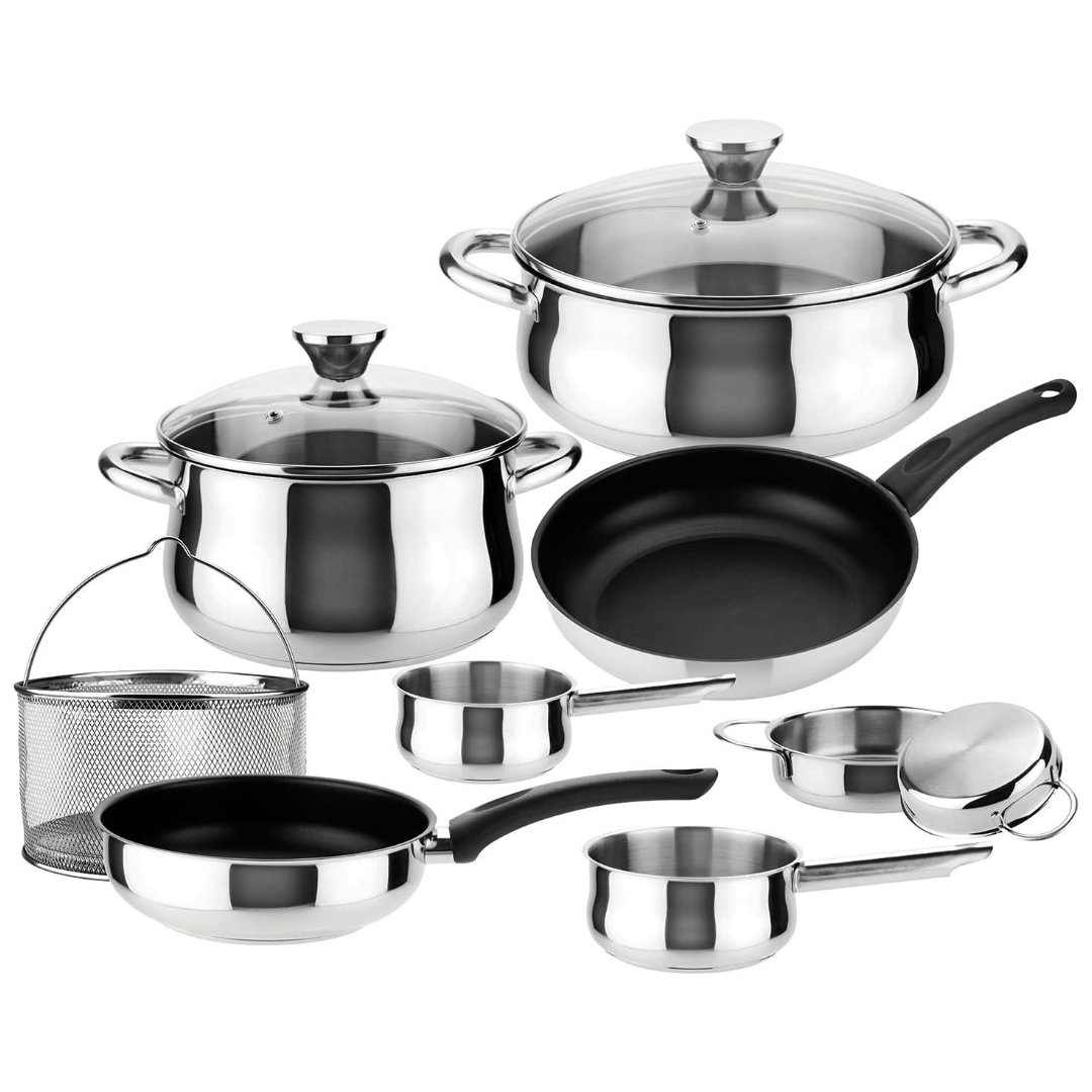 - El juego incluye: olla, olla con tapa de 9.4 pulgadas de diámetro y 7 cuartos de galón, olla con tapa de 7.9 pulgadas de diámetro y 4.2 cuartos de galón, cacerola de 6.3 pulgadas de diámetro y 1.4 cuartos de galón, cacerola de 5.5 pulgadas de diámetro y 1.2 cuartos de galón, mini salteado profundo de 6.2 pulgadas de diámetro, sartén de 9 pulgadas Diámetro, sartén 8 pulgadas de diámetro, cesta coladora de malla 7.3 pulgadas de diámetro.
