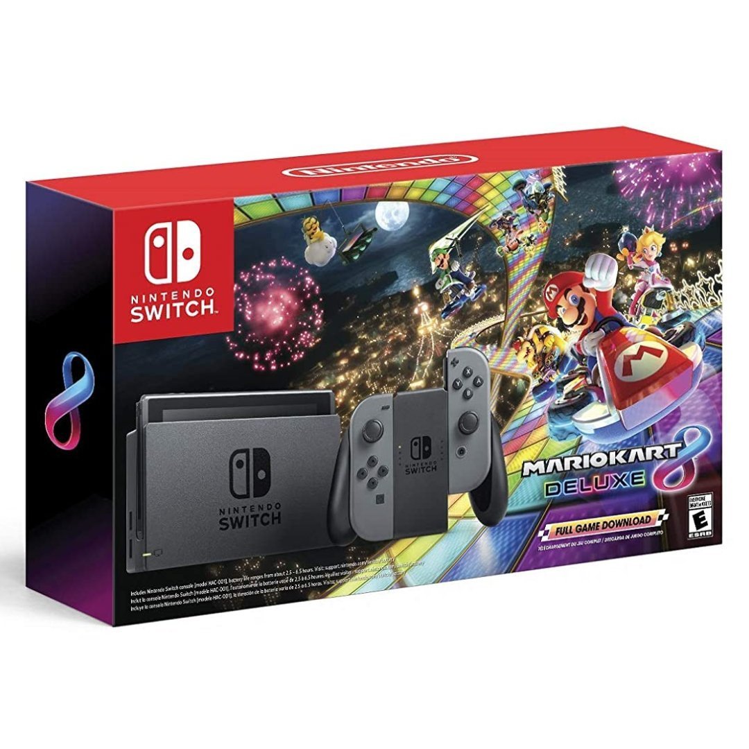 - Este paquete incluye la consola Nintendo Switch, dock, Joy Con (L) y Joy Con (R), 2 correas Joy Con, 1 agarre Joy Con, cable HDMI, adaptador de CA y un código completo de descarga de juegos para Mario Kart 8 Deluxe.